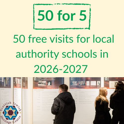 To mark the 5th anniversary of the Scottish Jewish Heritage Centre, we are offering 50 free class visits to local authority schools across Scotland during 2026 and 2027. In addition to waiving the visit fee we will also provide kosher-approved snacks for all pupils during their visit.